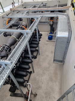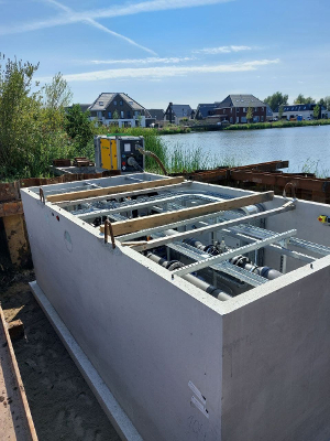Haitjema levert het complete WKO systeem met 18 bronnen. Op 2 september jl. is de volledig in eigen huis prefab ingerichte kelder geplaatst met daarin alle componenten voor de aquathermie (TEO) installatie. De komende dagen wordt op locatie het in- en uitlaatwerk naar het oppervlaktewater aangesloten.